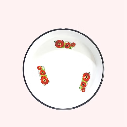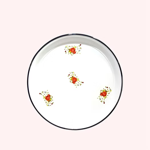 Klasik beyaz zemin üzerine çiçek desenli emaye sini, 9 farkli boy seçeneğiyle sunulur. Dayanıklı, şık ve nostaljik tasarımıyla çok amaçlı kullanıma uygundur.